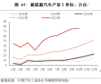 据中汽协,2022 年 10 月,新能源汽车产销分别完成 76.2万辆和 71.4 万辆,同比增长 87.6%和 81.7%。2022 年 1 至 10 月,新能源汽车产销分别达到 548.5 万辆和 528 万辆,同比均增长 1.1 倍,预计到今年年底新能源汽车产销数据将超过 600 万辆。2023年新能源汽车产量仍将保持高速增长,预计全年产量将达到900万辆。