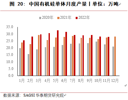 2022年国内工业硅价格震荡频繁,年初由于21年高价,价格小幅回落,春节后?,2月底3月初,有机硅新增产能投产,对工业硅需求增加,导致价格上涨,华东421价格从21700元/吨上涨至24500元/吨,华东553价格从19550元/吨上涨至22550元/吨。但工业硅整体供应量比较充足,叠加上海地区受疫情影响,铝合金终端汽车及有机硅终端建筑等均产生较大影响,随后价格持续回落,6月中旬华东553价格最低至16400元/吨,421价格18350元/吨,部分地区跌至成本线,随后上海复工复产,终端需求改善,价格短暂反弹上涨,但丰水期电价下调,价格又快速回落。