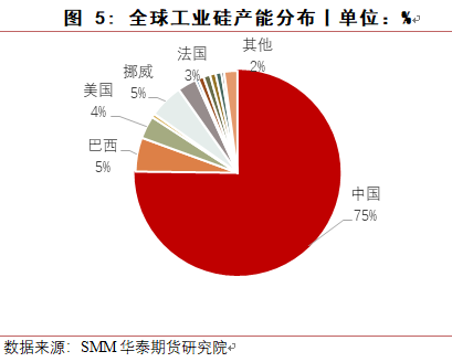 从全球产能分布来看,中国占据主导地位,2021年产量占比达到75%。除中国外,巴西、北美及北欧挪威产量占比较大,海外生产企业相对较少,主要是有机硅、铝合金等企业配套的原料生产厂。