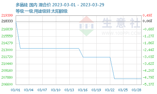 3月国内多晶硅市场弱势,型号为一级太阳能级的单晶致密料主流区间维持在20.0-22.0万元/吨。硅料厂家开工稳定,累库为主。下游硅片开工保持中高水平,硅片报价大稳小动。下游电池片和组件需求维持刚性,终端对高价原料接受度有限,预计后期价格维持震荡。
