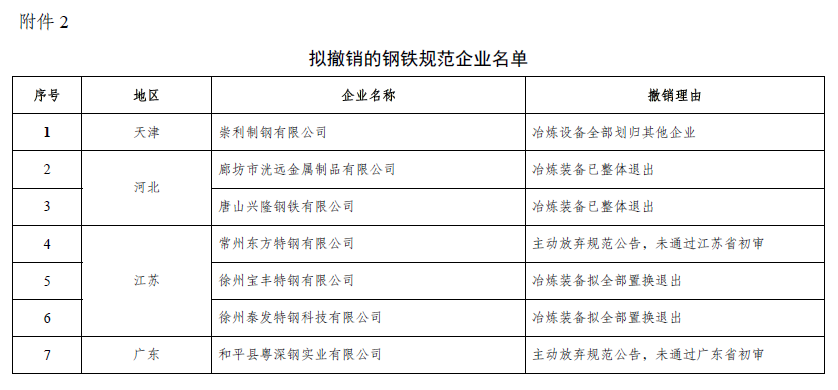 根据《钢铁行业规范条件(2015年修订)》和《钢铁行业规范企业管理办法》,工业和信息化部持续开展钢铁规范企业动态调整工作。经企业自查、地方工业主管部门初审、工业和信息化部组织专家核实,其中,13家企业符合《钢铁行业规范条件》,拟列入规范企业名单;7家企业存在未通过地方初审、冶炼设备拟全部关停退出等情形,拟撤销规范公告;13家企业存在环保、安全等问题,拟责令整改;12家企业冶炼装备变化、10家企业名称变化,拟予以变更。