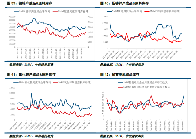 初端产成品来看,镀锌板库存较往年同比较低,镀锌板库存偏低是因为今年国内镀锌企业开工率持续低位,镀锌整体处于供需两弱的局面。上海封城期间镀锌企业原材料短缺问题严重,供给较需求受影响更大,造成镀锌企业库存处在偏低水平。压铸锌行业原料库存量偏低,产成品库存在显著去化后近期有所反弹,这也反映出在疫情期间,整体行业普遍出现了成品去库,随着交通运输的恢复,下游逐渐补充原料,提速生产,导致产成品在近期有所堆积。