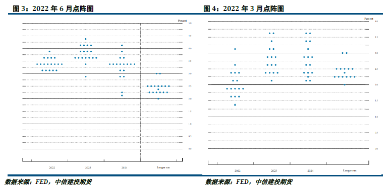 从点阵图上,也可以明显的看到,目前联储在2022年的目标利率已经提升了很多,并且一致性更强,反应出联储内部对于控制通胀的决心也较大。同时,从点阵图反应的远期利率目标来看,美联储内部对经济的信心也有所不足,在今年6月份的议息会议上,鲍威尔也表示,不排除未来美国经济进入衰退周期。
