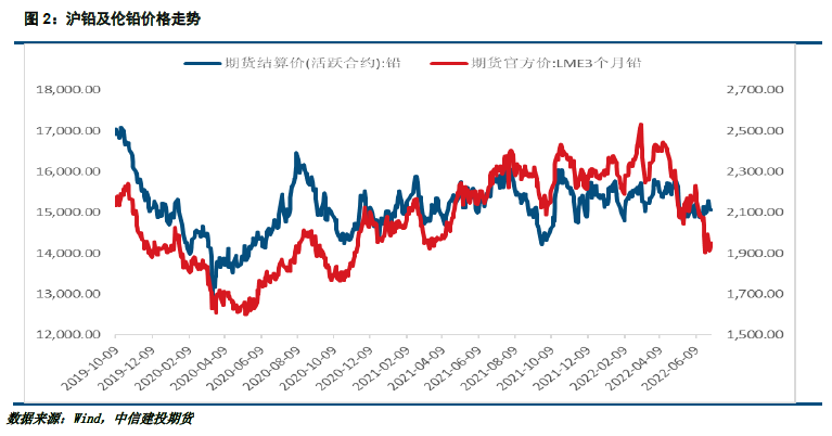 上半年铅价呈现区间震荡的趋势,但整体震荡区间有所下移。一季度海外铅价偏强运行,一方面是由于能源价格上涨抬升供应端成本,另一方面随着全球疫情防控的松动,海外需求快速复苏,在供需双强的背景下,显性库存去化,支撑价格偏强运行。国内价格跟随性上涨,内弱外强格局持续,内外盘价差一度接近历史极值。而进入二季度后,随着宏观情绪转弱,铅价跟随其他有色品种下跌,但是由于原生以及再生产量收缩,供应缩减对价格形成一定支撑。
