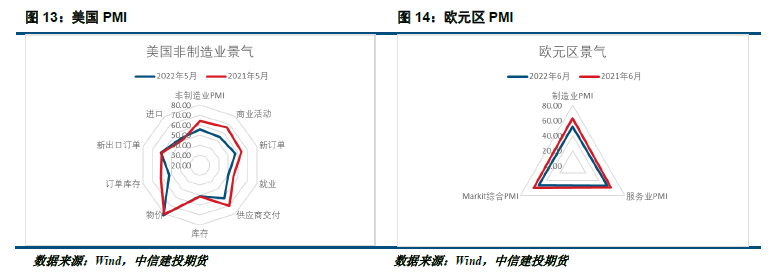 从全球市场的景气周期来看,上半年主要经济体的景气周期都出现了明显下滑,从最新公布的6月份的数据来看,美国6月Markit制造业PMI初值录得52.4,创23个月新低,Markit服务业PMI初值为51.6,创5个月新低。由于生活成本上升和需求下降,以及美联储提出的日益激进的加息路径,随之而来的整体金融状况恶化,企业对前景的担忧大大增加。此外,欧元区的PMI值也出现了明显下滑,欧元区6月制造业PMI终值 52.1,产出PMI为49.3。欧元区PMI的下滑也是主要来自于物价的上涨以及对经济前景的不确定性。
