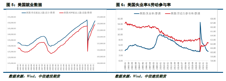 就业方面,上半年美国就业数据整体向好,从最近一次公布的5月份非农数据来看,5月新增非农就业人数39万人,这是2021年5月以来最小增幅。与此同时,4月份非农新增就业人数从42.8万人上修至43.6万人。如果按照当前的非农就业人口增加节奏,预计2022年7-8月可恢复到疫情前的水平。从就业供给端来看,美国劳动力市场供给持续恢复。当前非农就业人数距离疫情前还有接近0.5%的缺口,失业率3.6%与前期持平,处于2020年3月以来的最低水平。从劳动参与率来看,补充失业金停止发放后,就业意愿持续恢复,4月劳动参与率略有下滑后,5月劳动参与率小幅回升。