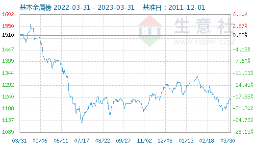 3月29日基本金属指数为1233点,较昨日上升了4点,较周期内最高点1616点(2022-03-09)下降了23.70%,较2015年11月24日最低点642点上涨了92.06%。(注:周期指2011-12-01至今)。