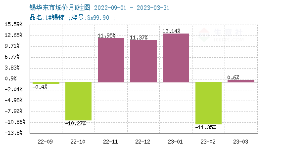 商品价格K柱图,运用价格走势K线的理念,以柱状图形式,反映每周或者每月的价格涨跌变化,投资者可以根据K柱图的变化,来进行买卖投资。红色表示:上涨;绿色表示:下跌;K柱高度表示:涨跌幅度。从月度K柱图可以看出2022年11月后受宏观因素影响,锡价连续上涨3个月,自2023年2月价格单月下跌11.35%。从周度度K柱图可以看出锡锭市场近期波动频繁,整体走势偏弱,本周受佤邦拟停产消息影响,锡价上行。