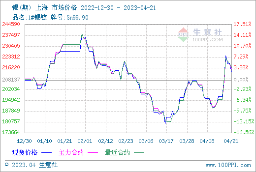 据生意社商品行情分析系统监测:本周(4.14-4.21)华东地区1#锡锭市场先涨后跌,4月14日市场均价在197160元/吨,4月21日市场均价在213510元/吨,周涨8.29%。