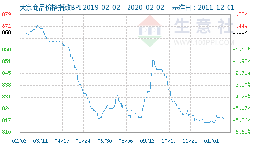 2月2日大宗商品价格指数BPI为818点,与昨日持平,较周期内最高点1019点(2012-04-10)下降了19.73%,较2016年02月03日最低点660点上涨了23.94%。(注:周期指2011-12-01至2020-02-02)