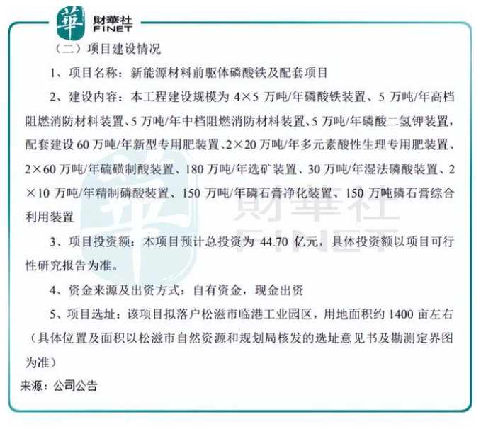 6月29日,史丹利发布公告称,公司将以史丹利宜化作为项目实施主体,以自有资金投资44.70亿元在湖北省松滋市建设新能源材料前驱体磷酸铁及配套项目。