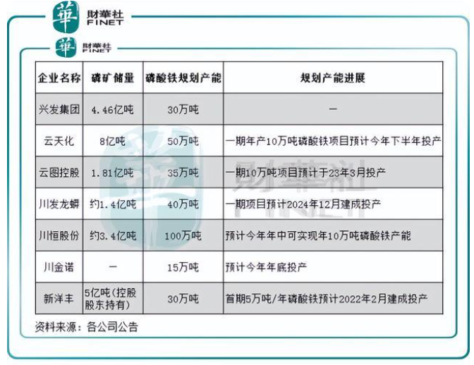 根据财华社统计,目前云天化、兴发集团和云图控股(002539.SZ)等企业拥有自身的磷矿资源,这些企业将磷矿资源视为提升自身在新能源产业领域竞争力的重要基础。得益于磷矿资源和一体化产能优势的支持,这些企业得以大步跨界布局磷酸铁业务。如芭田股份(002170.SZ)的“磷矿—磷酸—磷酸铁”完整产业链已经初具规模,其磷矿在建产能达到90万吨/年,有望为其新能源产业注入活力。