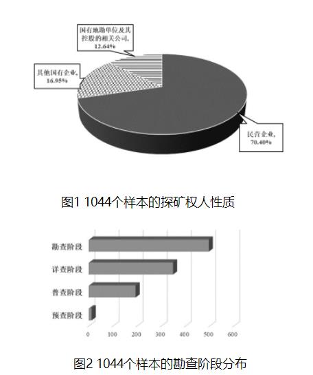 抽样数据显示,1044个探矿权中有57.6%设立在2008年和2009年,而2010~2021年设置的探矿权占比仅为42.4%。这样的分布结构与近年来公布的新立非油气探矿权分布结构基本一致,说明所抽取样本能够基本反映全国探矿权的情况。