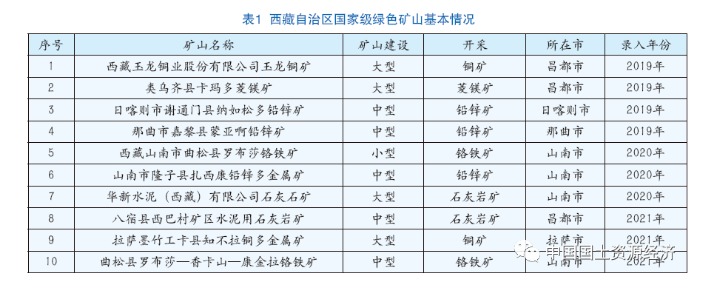 西藏自治区绿色矿山建设虽然起步晚于其他省份,但目前已进入常态化阶段。2018年,西藏自治区自然资源厅出台了《西藏自治区绿色矿山建设管理暂行办法》,明确要求在西藏自治区行政区域范围内,除开采砖瓦用页岩,建筑用砂、石,水、气、地热等矿种外,采矿权(剩余)年限在3年(含)以上的,具有独立采矿权的矿山企业,采矿权人应当建设绿色矿山,做到应建必建。截至2020年底,全区共有国家级绿色矿山8家。2021年,西藏自治区自然资源厅根据九大行业绿色矿山建设规范、《绿色矿山建设评价指标》等文件要求又遴选出3家国家级绿色矿山,且均为新建矿山,但目前还未列入国家级绿色矿山名录。2022年6月,按照自然资源部要求,西藏自治区自然资源厅对已纳入国家级绿色矿山名录的8家矿山开展“回头看”工作,结合中央第四生态环境保护督察组向西藏自治区反馈的督察情况,将2019年入选的日喀则市仲巴县扎布耶盐湖矿移出国家级绿色矿山名录。因此,目前西藏自治区实际达到国家级绿色矿山建设标准的矿山共10家(表1)。截至目前,西藏自治区共有自然资源部和自治区自然资源厅颁发的采矿许可证109个,实际生产矿山34家,其中花岗岩矿1家、铜多金属矿4家、石灰岩矿6家、菱镁矿1家、铅锌矿8家、盐湖矿2家、岩金矿1家、铬铁矿2家、矿泉水8家、地热1家;国家级绿色矿山中有铜多金属矿2家、石灰岩矿2家、菱镁矿1家、铅锌矿3家、铬铁矿2家。